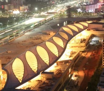 ETFE的中文名為乙烯-四氟乙烯共聚物。ETFE膜材的厚度通常小于0.20mm,是一種透明膜材。2008年北京奧運會國家體育館及國家游泳中心等場館中將采用水立方的外墻是用ETFE膜制成的這種膜材料。本工程位于湖北省襄樊市商業(yè)街,總建筑面積:3600平方米。膜材采用ETFE+PVDF膜材,此種膜材形式的搭配是現(xiàn)在商業(yè)街天幕膜結(jié)構(gòu)的總體趨勢。優(yōu)點:美觀、實用。