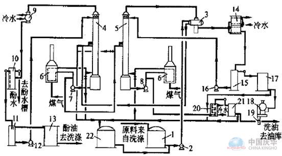 注:(1—原料槽;2—原料泵;3—原料與工業(yè)萘換熱器;4—初餾塔;5—精餾塔;6—管式爐;7—初餾塔熱油循環(huán)泵;8—精餾塔熱油循環(huán)泵;9酚油冷凝冷卻器;10—油水分離器;11—酚油回流槽;12—酚油回流泵;13—酚油槽;14—工業(yè)萘汽化冷凝冷卻器;15—工業(yè)萘回流槽;16—工業(yè)萘回流泵;17—工業(yè)萘貯槽;18—轉(zhuǎn)鼓結(jié)晶機;19—工業(yè)萘裝袋自動稱量裝置;20—洗油冷卻器;21—洗油計量槽;22—中間槽)